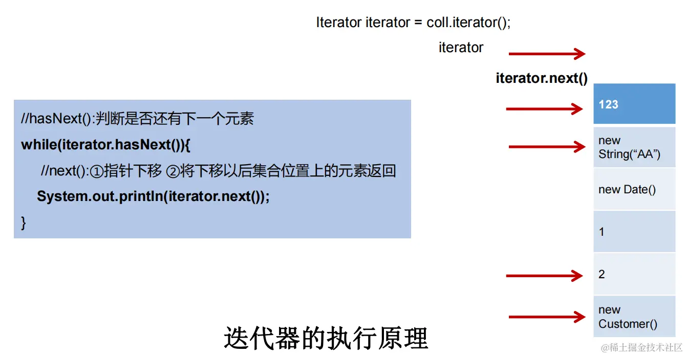 - 集合对象每次调用iterator()方法都得到一个全新的迭代器对象,默认游标都在集合的第一个元素之前。