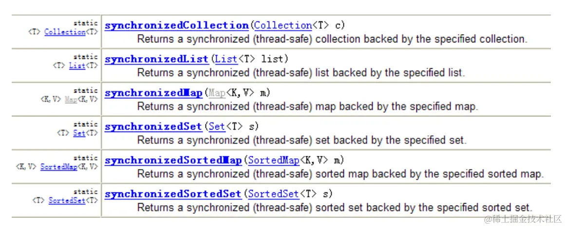 Collections类中提供了多个synchronizedXxx()方法,该方法可使将指定集合包装成线程同步的集合,从而可以解决多线程并发访问集合时的线程安全问题