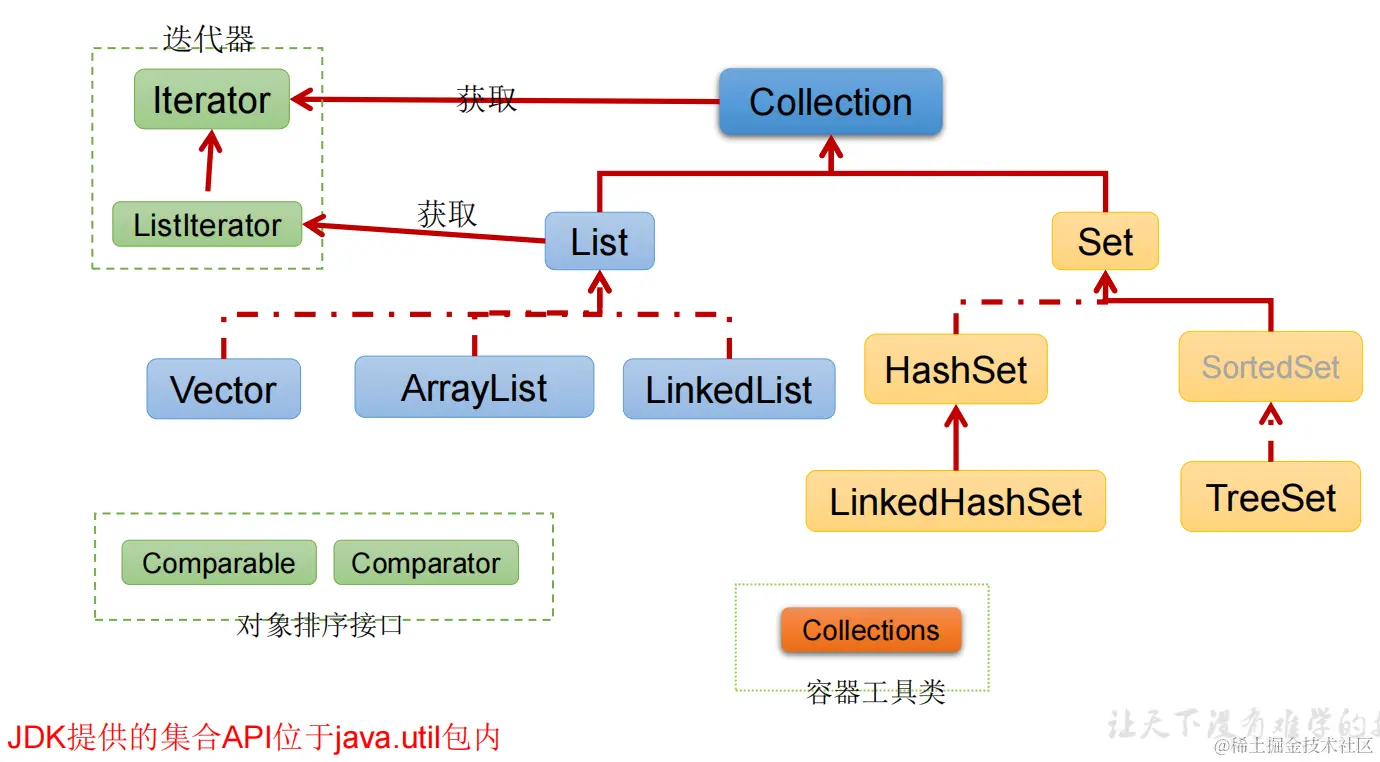 java.lang.Iterable接口,该接口有一个iterator()方法,那么所有实现了Collection接口的集合类都有一个iterator()方法,用以返回一个实现了Iterator接口的对象。 - Iterator仅用于遍历集合,Iterator本身并不提供承装对象的能力。如果需要创建Iterator对象,则必须有一个被迭代的集合。