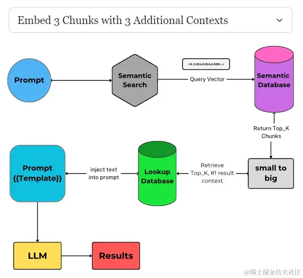 在这种方法中,你不仅嵌入块本身,还嵌入块的周围上下文(例如,前面和后面的块)。 这使得语义检索系统能够考虑更广泛的块上下文,而无需实际增加 LLM 正在处理的块的大小。