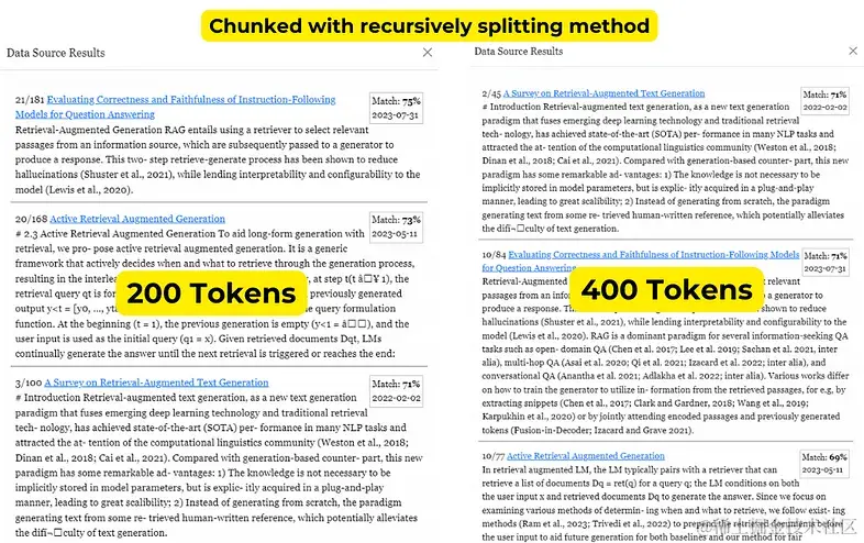 例如,当你搜索 “retrieval augmented generation” 并比较 200 和 400 块的结果时,你会注意到不同的结果。 在大多数情况下,如上所示,200 和 400 的结果差异可能不会很大。 上面的屏幕截图显示了典型的情况:大多数相同的相关信息可能会出现在两种情况下,但是,结果的相似度分数和排名可能会有所不同。 这是预期的,因为较小的块将具有更集中的上下文,而较大的块将包含可能与用户的查询相关或不相关的附加信息。