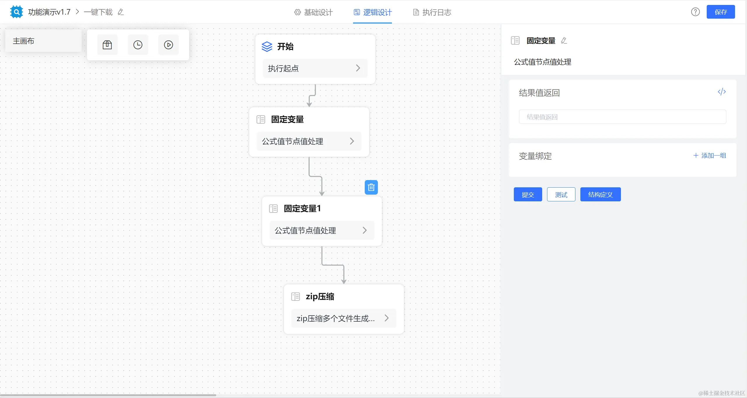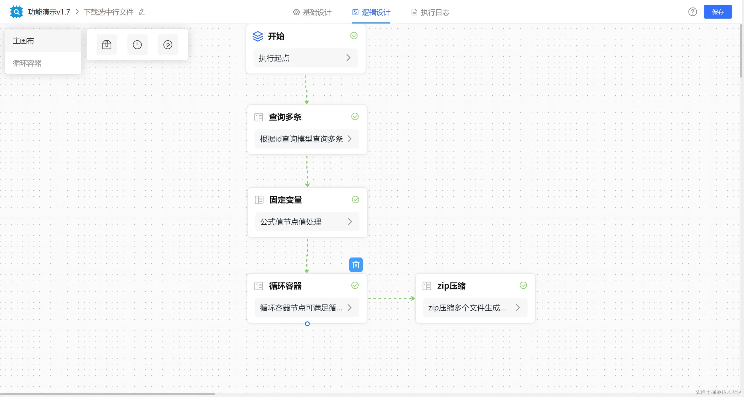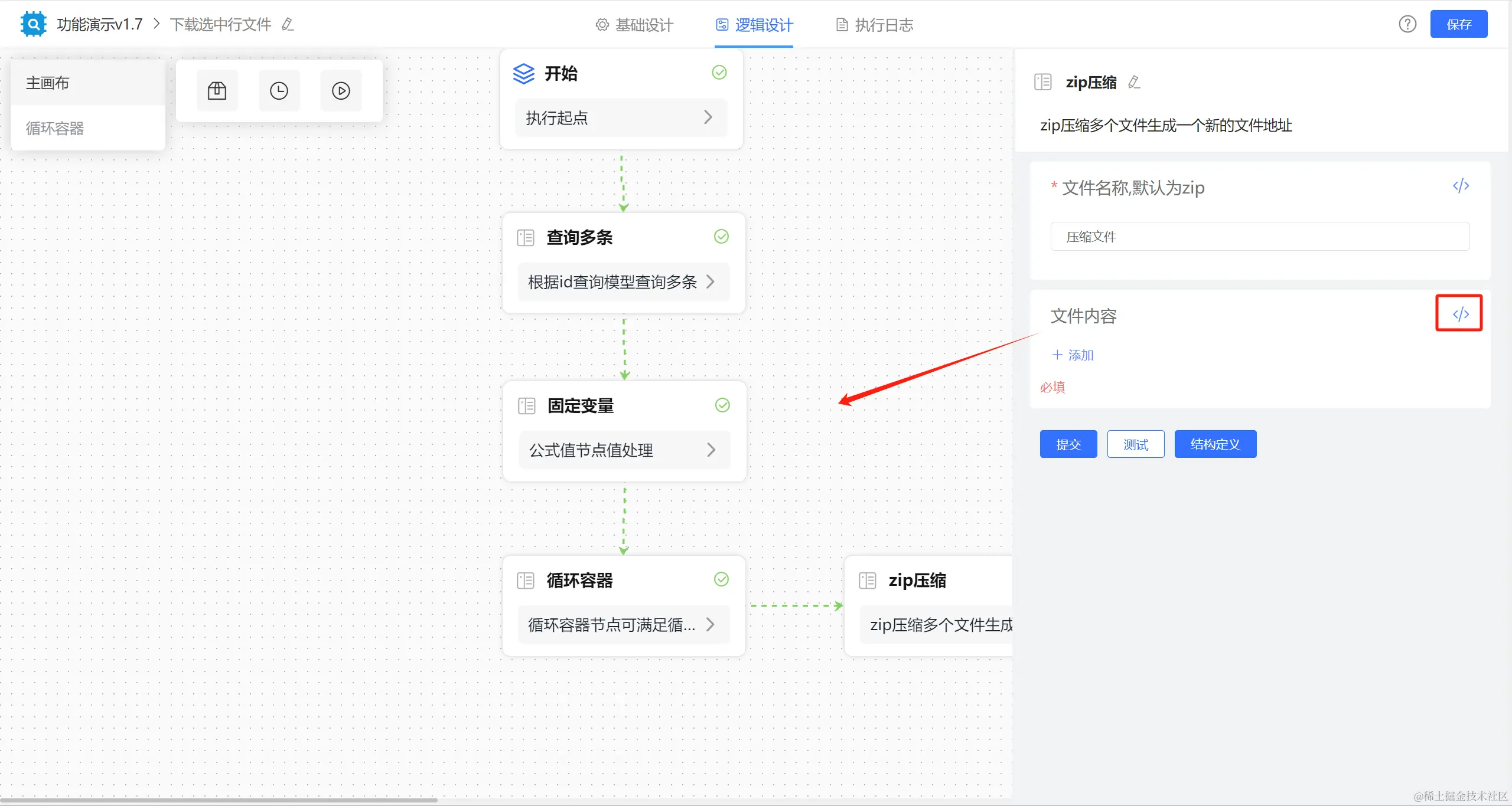 举例如下:通过【查询多条】节点获取列表勾选的数据,【固定变量】节点获取循环容器内的节点赋值,再通过【循环容器】取每一条数据,并将每一条数据中的文件数据拼接赋值给【固定变量】节点,最后通过【zip压缩】节点直接取固定变量节点的值实现打包下载多行数据多个文件。