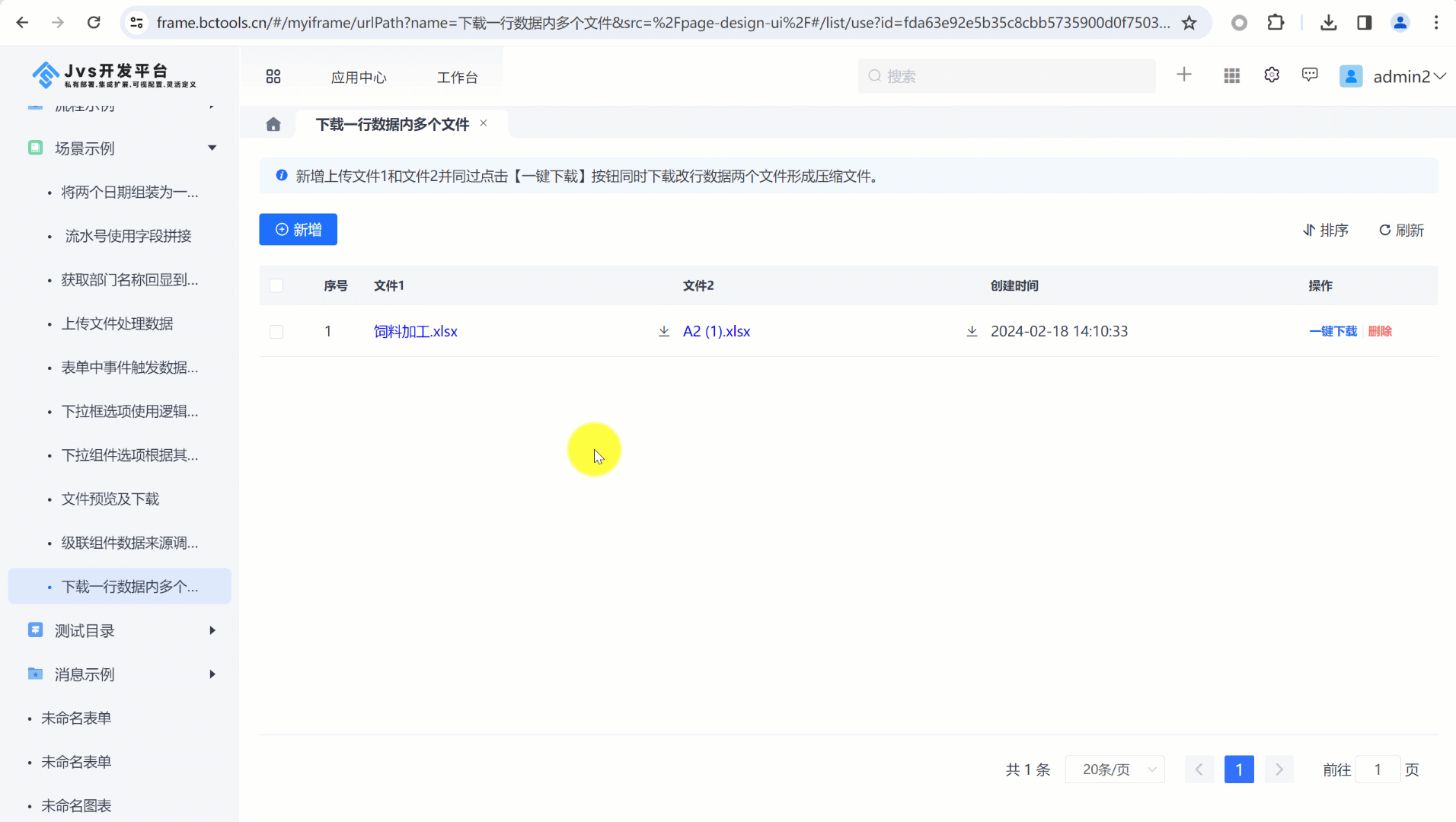通常在列表页面中一条数据存在多个文件,我们不需要一个一个去下载,想直接一键把这条数据中的文件全部下载下来,打包生成压缩文件。现在我们就可以通过列表页配置一个行内按钮点击触发逻辑下载该条数据全部文件。