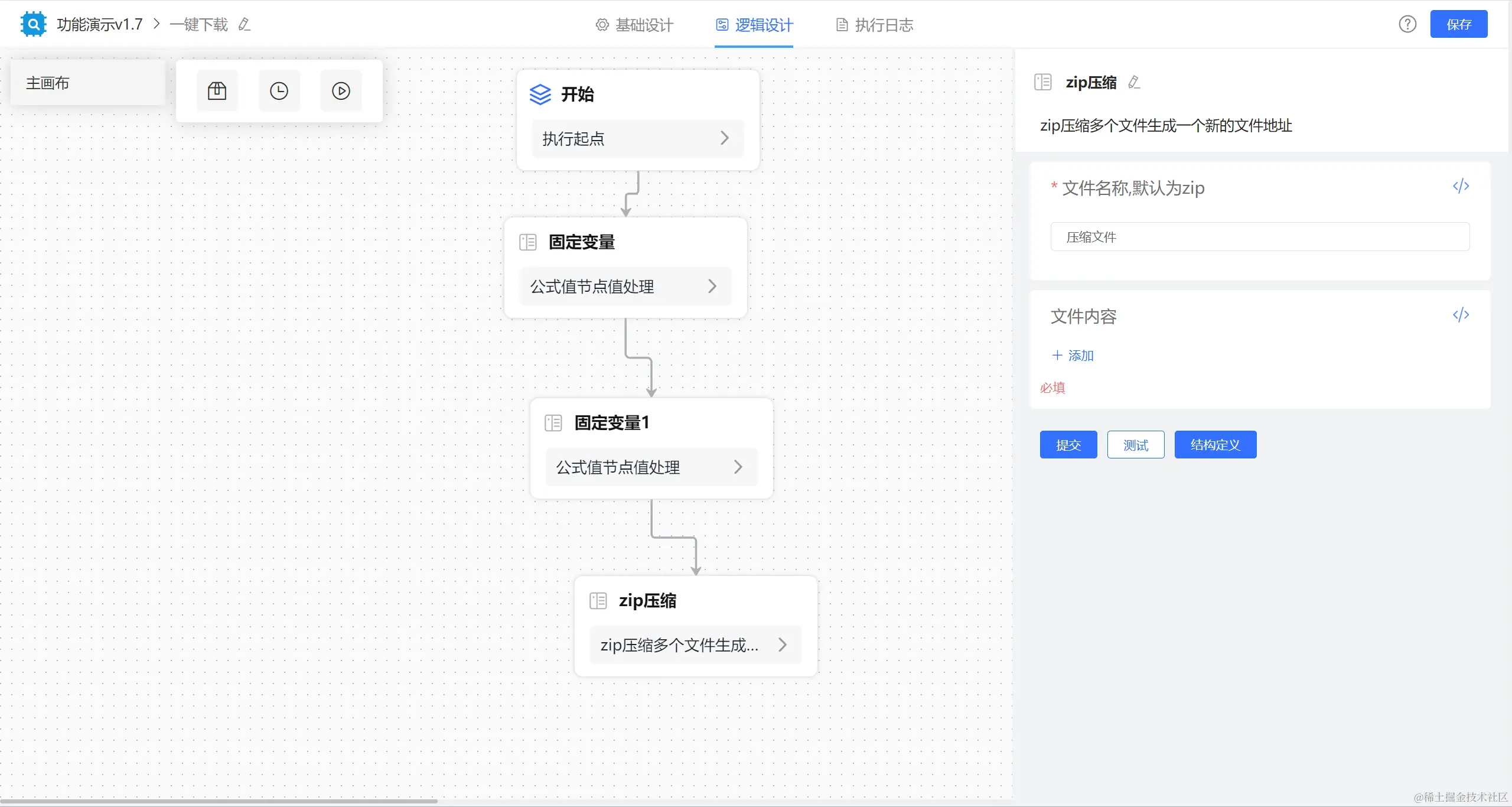 【zip压缩】节点文件内容按公式取【固定变量】节点的值。注意这里多个文件格式是数组对象。