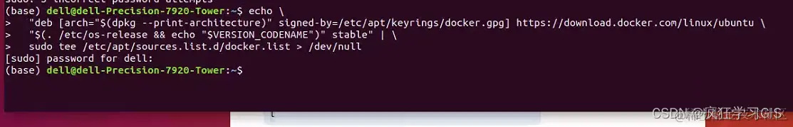 随后,tee是一个用于从标准输入读取数据并将其写入文件的命令。/etc/apt/sources.list.d/docker.list是要写入数据的文件路径。> /dev/null是将命令的输出重定向到空设备(null设备),即丢弃输出。该命令的目的是使用sudo权限将Docker软件源的配置信息写入到/etc/apt/sources.list.d/docker.list文件中,并将输出重定向到空设备,以避免输出到终端。