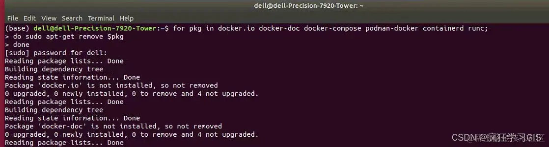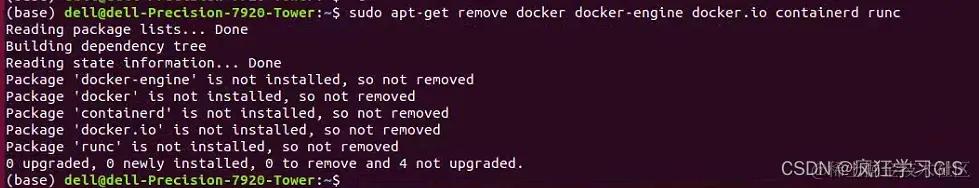 上述代码使用apt-get命令来移除Docker相关软件包和容器运行时的命令。其中,sudo是一个用于以超级用户(root)权限运行命令的关键词;通过使用sudo,可以执行需要管理员权限的操作。随后的apt-get是用于在Debian和Ubuntu等基于Debian的Linux发行版中进行软件包管理的命令行工具。remove是apt-get命令的一个选项,用于从系统中卸载指定的软件包。docker、docker-engine、docker.io、containerd和runc都是要卸载的软件包的名称,指定了Docker及其相关组件的软件包名称。通过在命令中列出这些软件包的名称,apt-get将卸载它们及其相关的文件和配置。