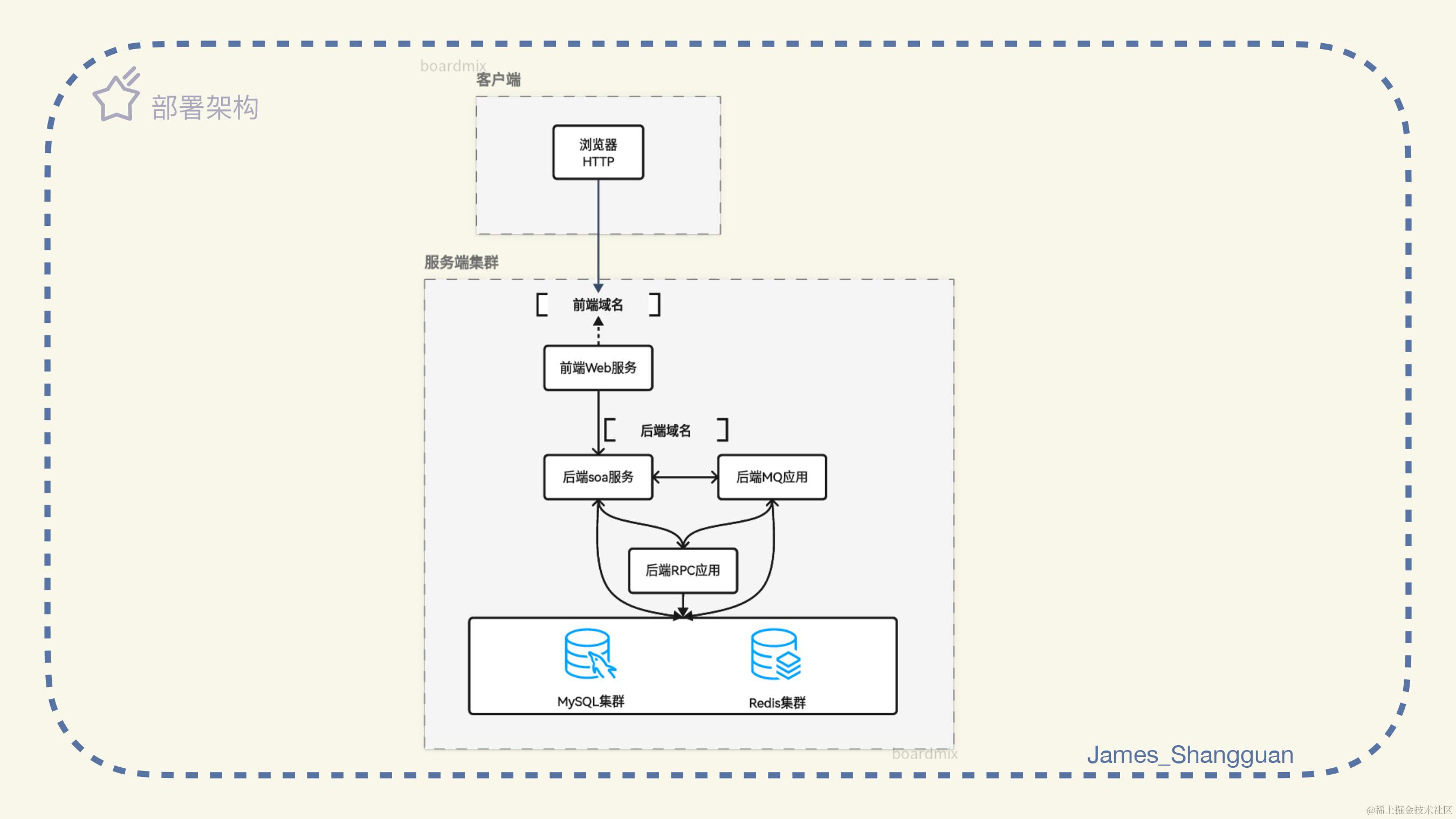 后端采用的是微服务架构,按照功能拆分为提供HTTP接口的soa应用、提供MQ消费功能的MQ应用、提供RPC服务的RPC应用,存储使用的是MySQL和Redis集群,大概架构图如下: