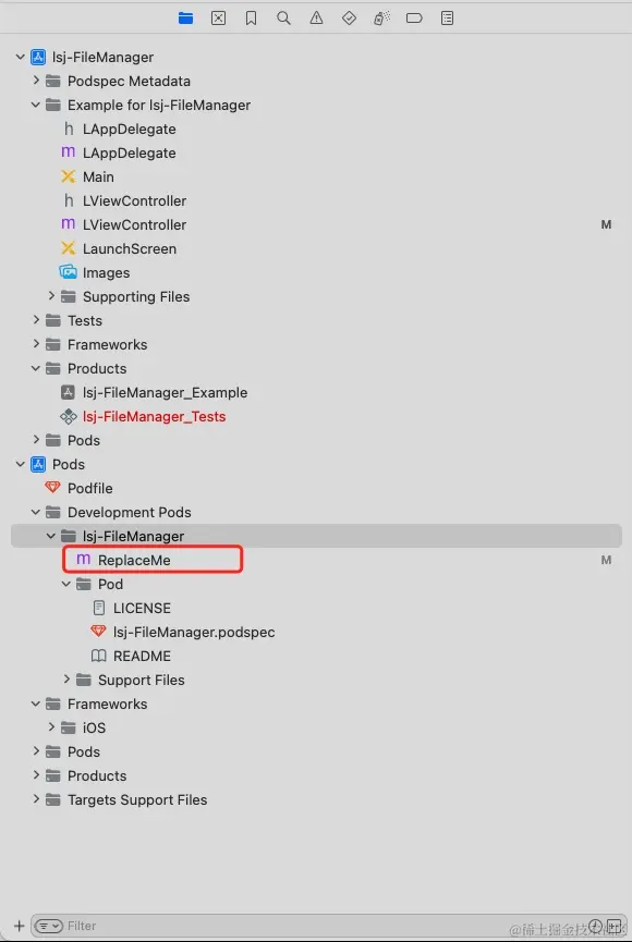 在工程的Pods/Development/Pods/lsj-FileManager/目录下,有一个 ReplaceMe 文件,
