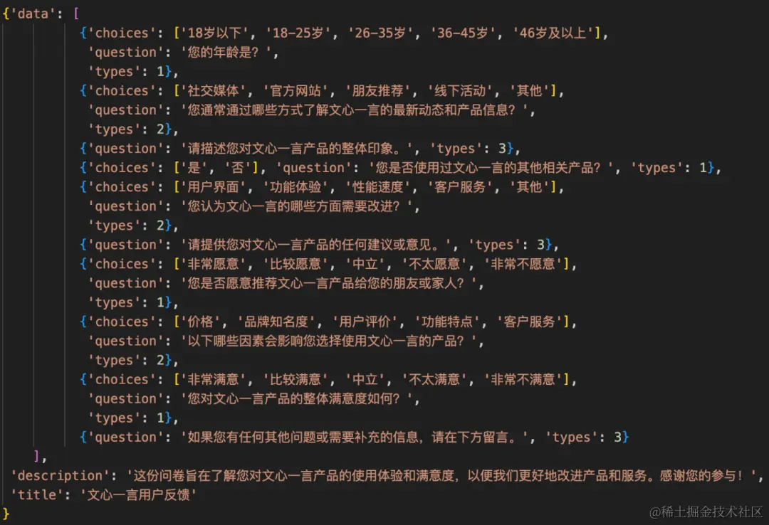 本文的问卷网页生成任务,本质上就是生成一个多层嵌套结构的数据,并与前端交互渲染形成可视化网页,下面开始给大家演示和解析代码。