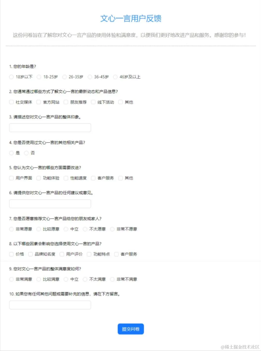 以文心一言用户反馈作为问卷的主题,生成一份包含10道题的问卷。