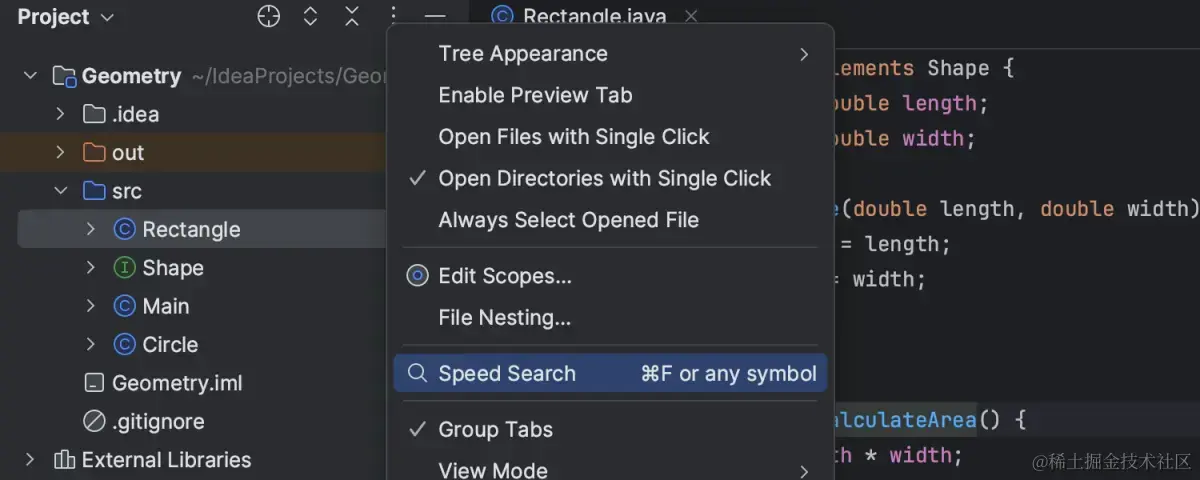 现在可以通过快捷方式使用快速搜索 功能,该功能允许您在工具窗口和对话框中快速导航。将焦点置于树或列表上后,您可以轻松地从工具窗口的 “选项”菜单中调用搜索。或者,您可以使用快捷方式 ⌘F,或者直接开始输入您的查询。您可以在 “设置/首选项|”中为“快速搜索”功能分配自定义快捷方式。键位图。