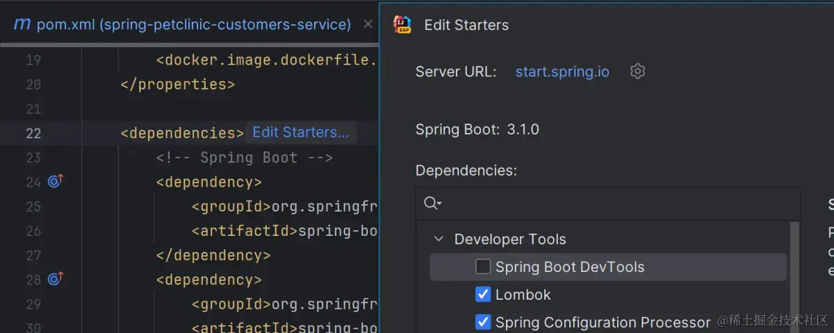 现在,您可以在项目的现有模块中添加和修改 Spring Boot 启动器,从而更轻松地管理 Maven 和 Gradle 依赖项并调整项目的配置。要添加或删除启动器依赖项,请分别使用 Ctrl+Click出现在 或文件的或块 旁边的“编辑启动器”嵌入小部件。