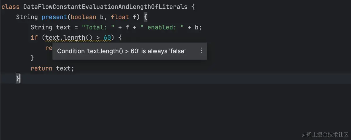 IntelliJ IDEA 的代码分析现在涵盖了更多场景,用于识别和突出显示始终评估为相同值的条件表达式中的潜在错误。例如,IDE 现在可以识别可能的字符串长度或估计字符串串联结果,从而在检测到冗余或可能有问题的代码时提示进行检查。