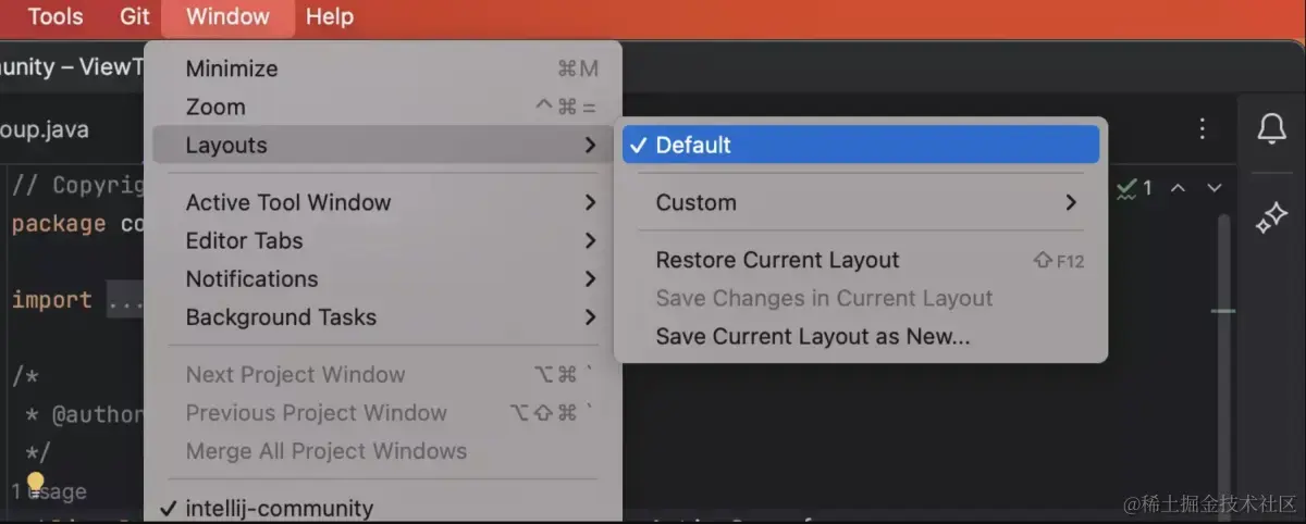 IntelliJ IDEA 2023.3 进一步改进了 v2023.1 中引入的保存多个工具窗口布局并在它们之间切换的功能。新的默认布局选项提供了一种将工作区的外观恢复为其默认状态的快速方法。此布局不可自定义,可以通过*Window |访问。布局。