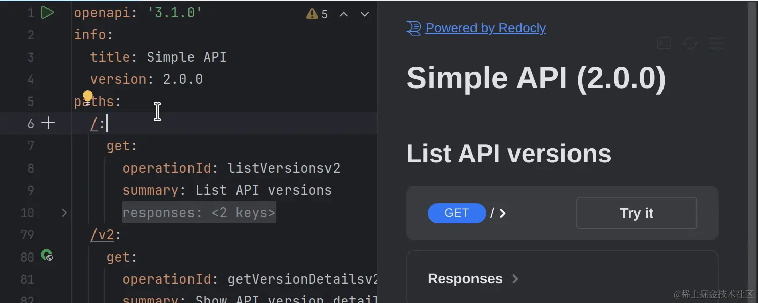 Swagger UI集成版本已更新至5.0。您可以通过浮动工具栏操作在 OpenAPI 文件中的 Redoc 和更新的 Swagger UI 预览之间切换。从 v5.0 开始,Swagger UI 还支持 OpenAPI 3.1 规范。