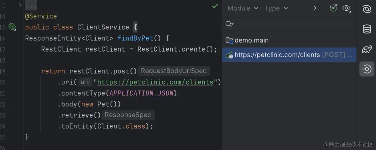扩展了对 Spring 6.1 功能的支持。对于新的 RestClient,IDE 现在提供全面支持,包括 URL 自动完成、查找用法功能以及在**端点工具窗口中查看所有客户端用法的功能。此外,我们还为新的 JdbcClient实现了 SQL 突出显示和参数名称代码完成。IntelliJ IDEA Ultimate 现在还可以识别@Scheduled调度程序属性,为该上下文中使用的 bean 名称提供补全建议和验证。