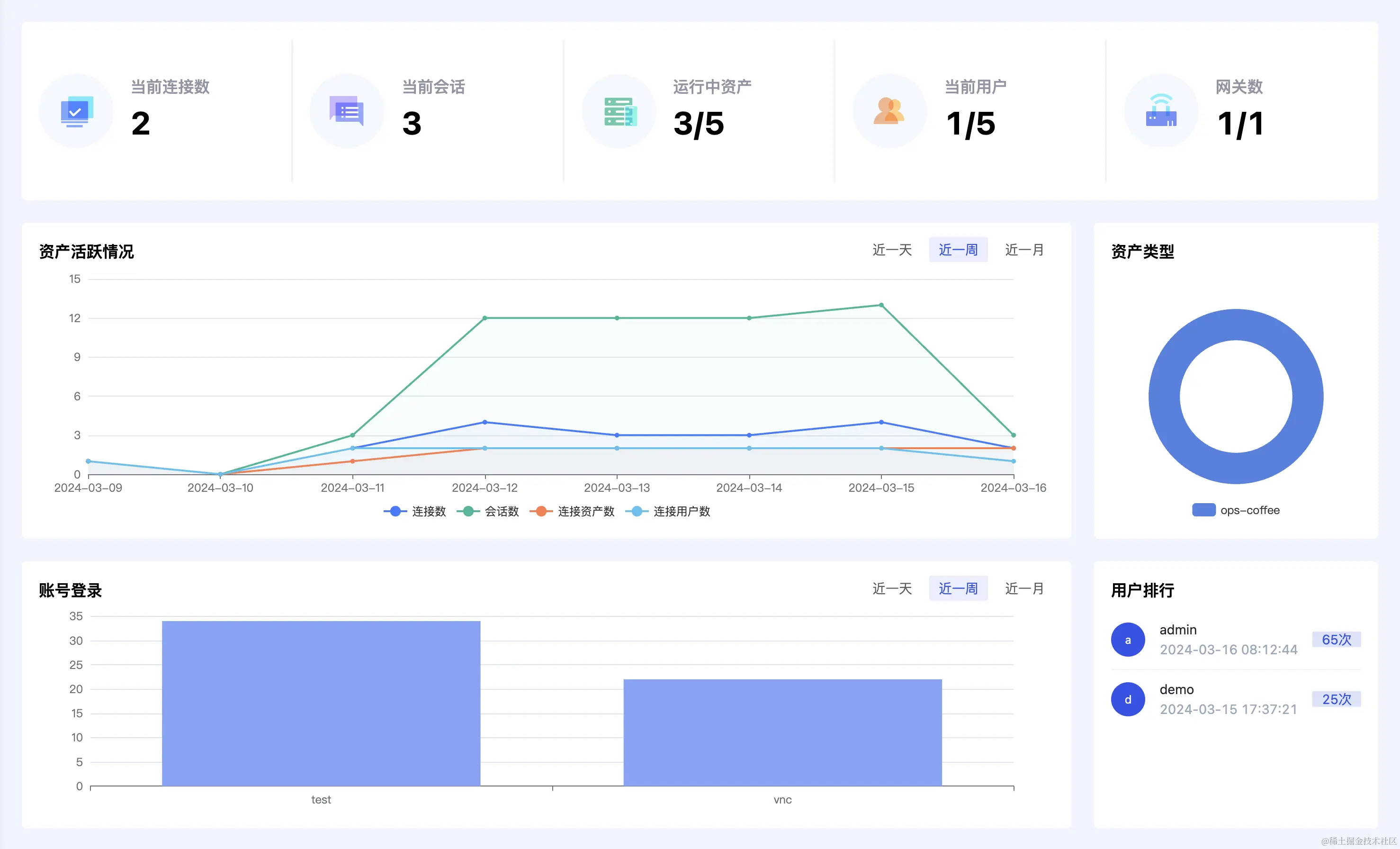 除了这些以上这些堡垒机必须的基础的功能外,OneTerm也提供了个Dashboard大盘,可以全面掌握系统情况,包括连接、资产、会话、用户、网关等信息,还是图表好看