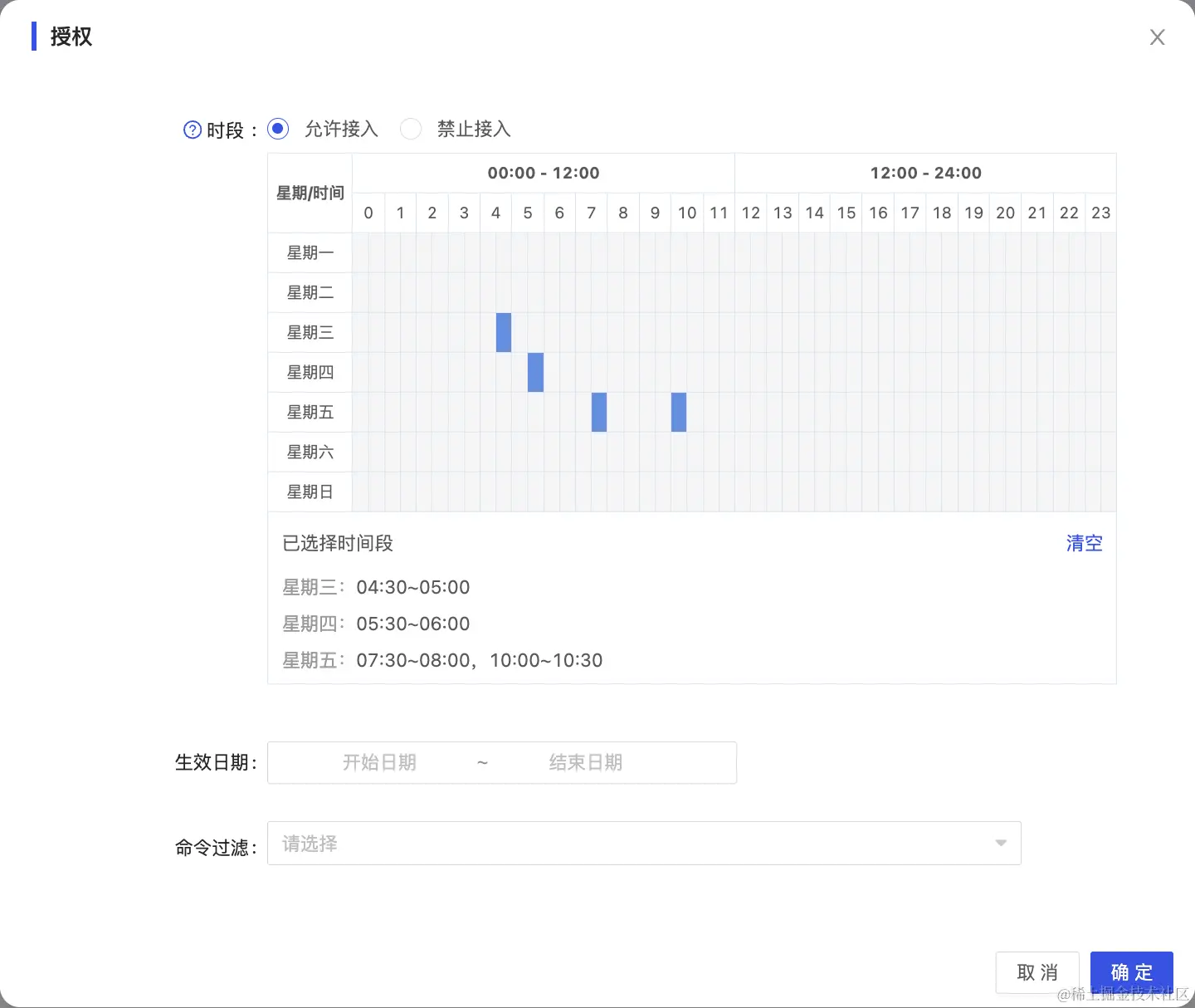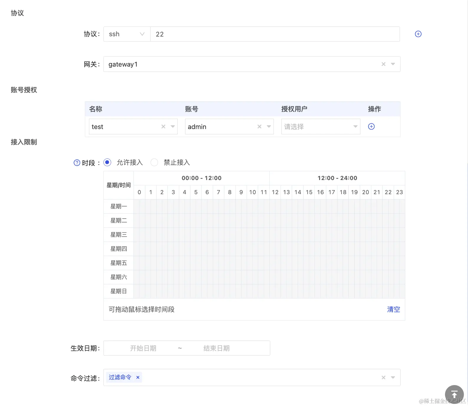 接入时间的限制更是十分的灵活,不仅支持指定生效日期,同时也可以按照星期来配置生效时间,还支持选择某一天的某个时间段,非常强大