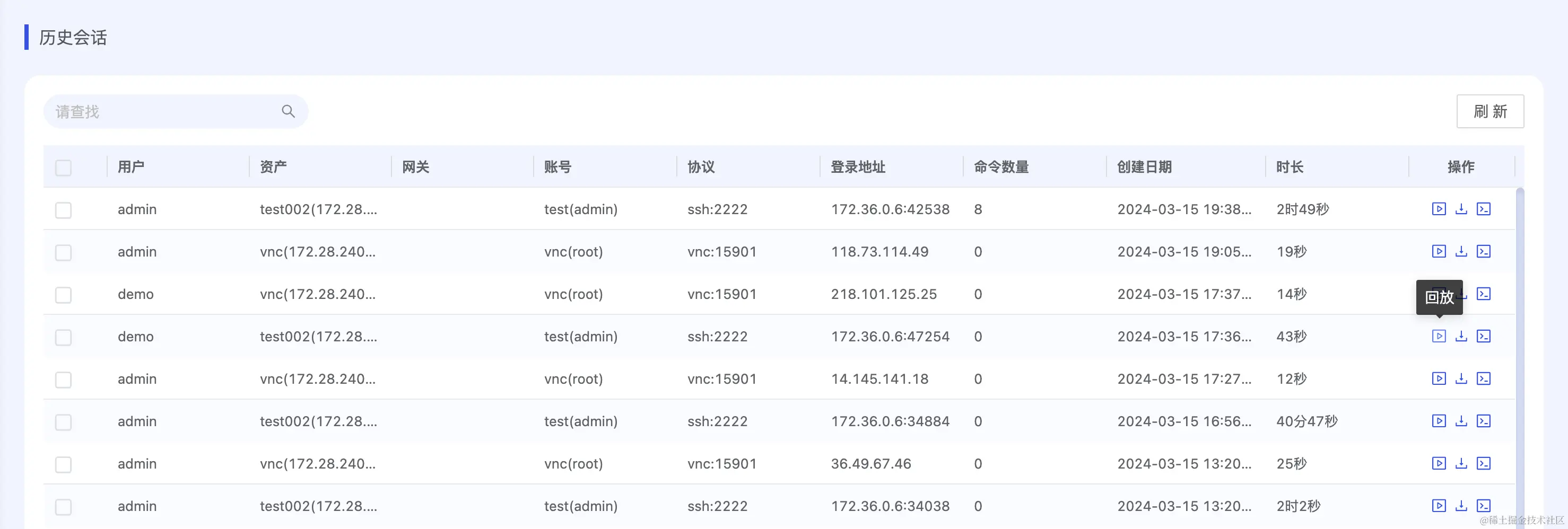 同时OneTerm也支持查看历史回话,对历史回话进行回放、下载以及执行命令查看等审计操作