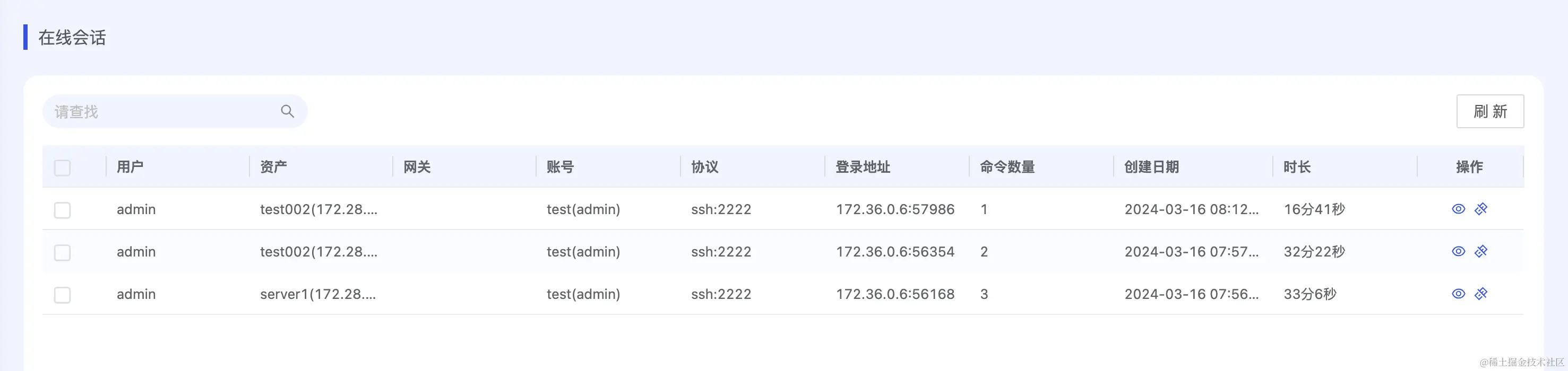 堡垒机除了能够终端登陆操作外,还有个比较重要等功能,那就是需要支持终端会话审计,包括查看当前在线会话连接,实时监控当前在线会话,以及在发现当前会话有危险和不当操作时对当前在线会话下达强制断开的指令,这些OneTerm也都是支持的