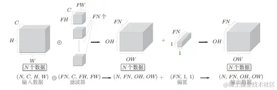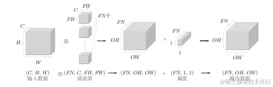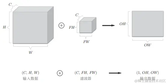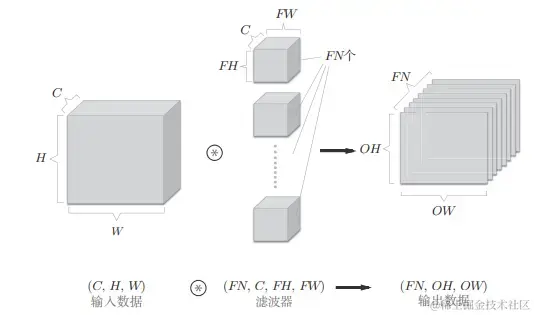 将其表示成方块来考虑,输入数据为(C,H,W)的形状,滤波器为(C,FH,FW)的形状