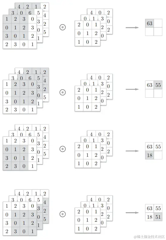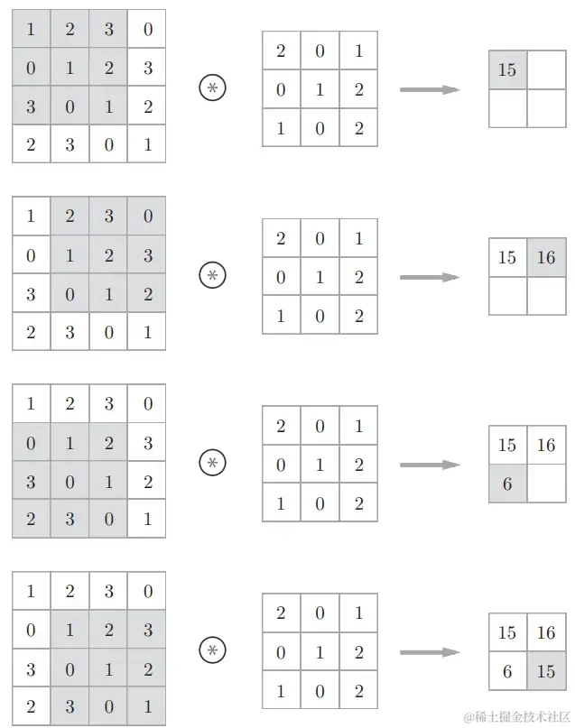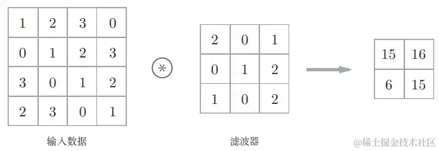 具体怎么计算的,是将各个位置上滤波器的元素和输入的对应元素相乘,然后再求和,将这个结果保存到输出的对应位置; 将这个过程在所有位置都进行一遍,就可以得到卷积运算的输出