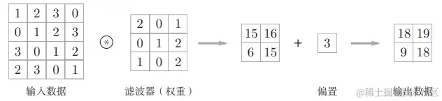在CNN中,滤波器的参数就对应了之前的权重,除此之外,CNN中还存在着偏置,计算方式如下