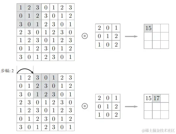 滤波器每次应用移动的距离就称为步幅,像假如把步幅设为2,如图所示
