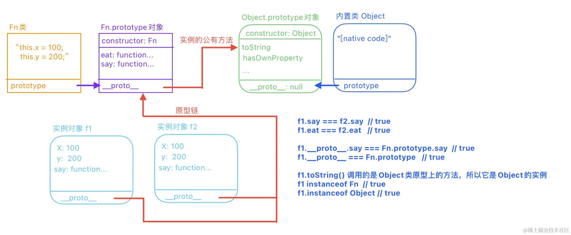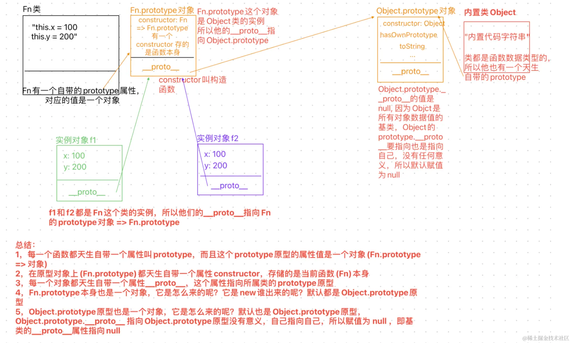 - 3,每一个对象都天生自带一个属性叫__proto__,这个属性指向所属类的prototype这个原型 当我们通过实例调取某一个属性的时候,首先看看是不是私有属性,是私有的就拿私有的,如果不是私有的,默认通过__proto__往所属类的原型上找,如果没有的话,再通过原型上的__proto__再往上找...直到找到Object这个类的基类的原型(Object.prototype)为止,这个机制叫原型链查找机制