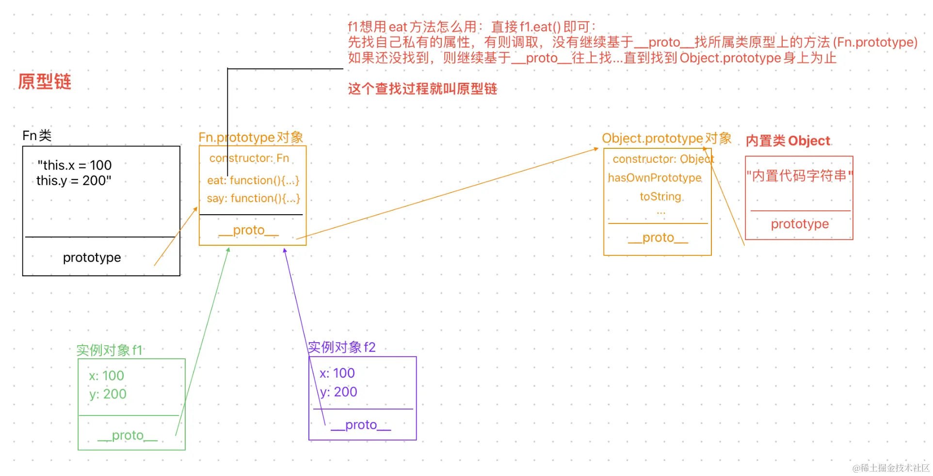 原型链:先找自己私有的属性和方法,找到直接调用,找不到继续基于__proro__的所属类的原型(Fn.prototype)查找相应的属性和方法....直到找到Object这个类的基类的原型(Object.prototype)为止