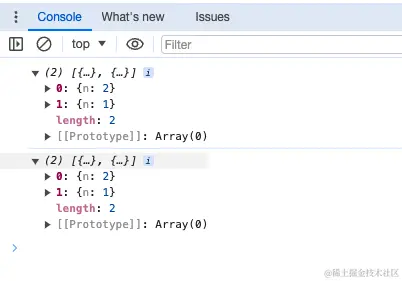 运行代码后,浏览器调试界面应该输出的是[{ n: 1 }, { n: 1 }] 和 [{ n: 2 }, { n: 1 }], 但是实际运行结果