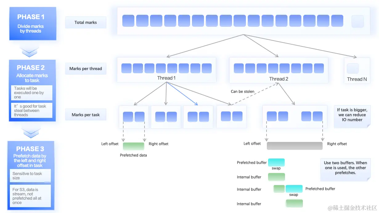 通过预先设定 Range 减少 HTTP 请求次数,查询 Session 复用,以及 Prefetch 机制,我们实现了 40% 的性能提升。但是,这其中依然存在可优化的部分。一次查询中,所有需要查询的 Mark 会平均划分到各个线程。在各个线程内部,又会被平均划分为更细粒度的 Read Task,每个 Read Task 都包含一定数量的 Mark Range。这种细粒度的划分可以方便查询线程之间互相 Steal Work,避免由于某个线程过慢引发的长尾问题。