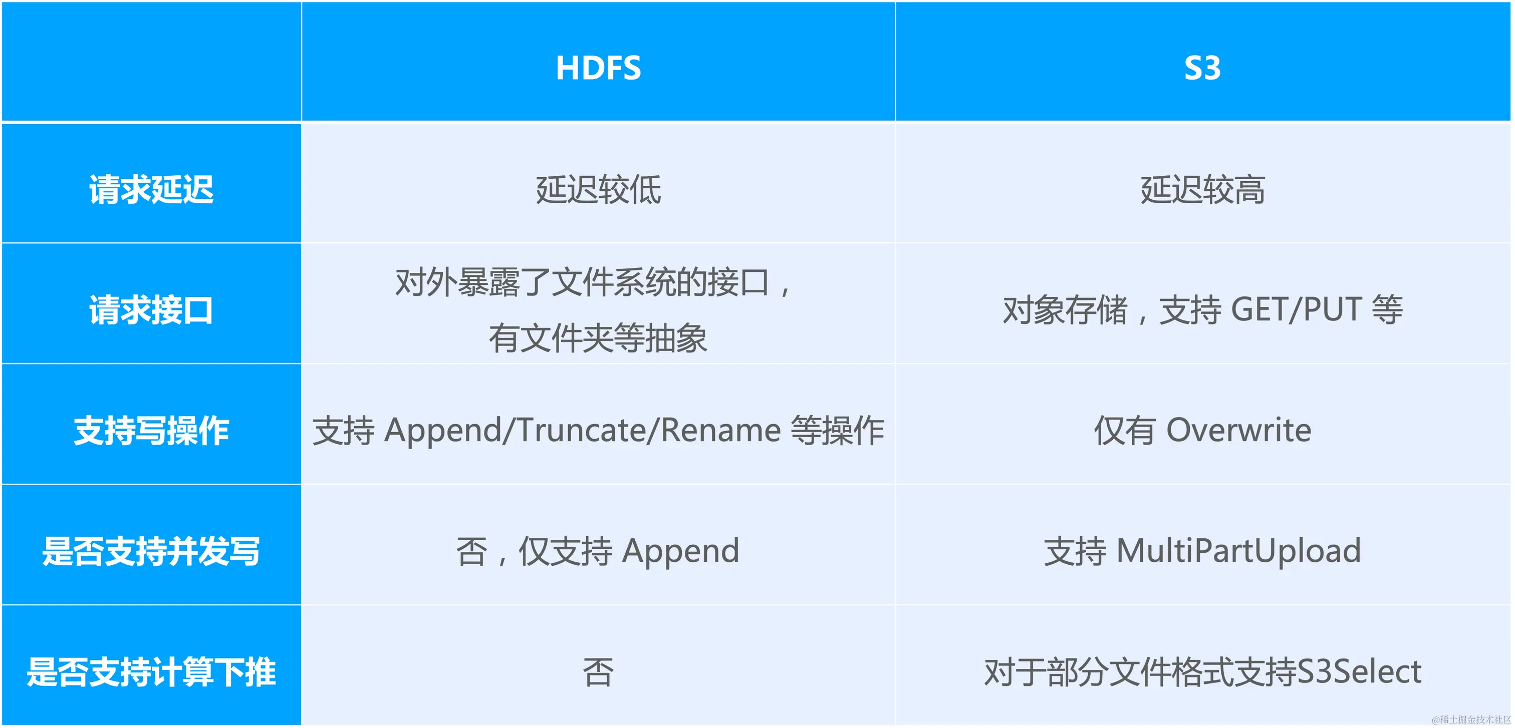 从支持写操作 的类型来说,HDFS 支持 Append,Truncate 和 Rename 等操作, S3 仅支持 Overwrite;