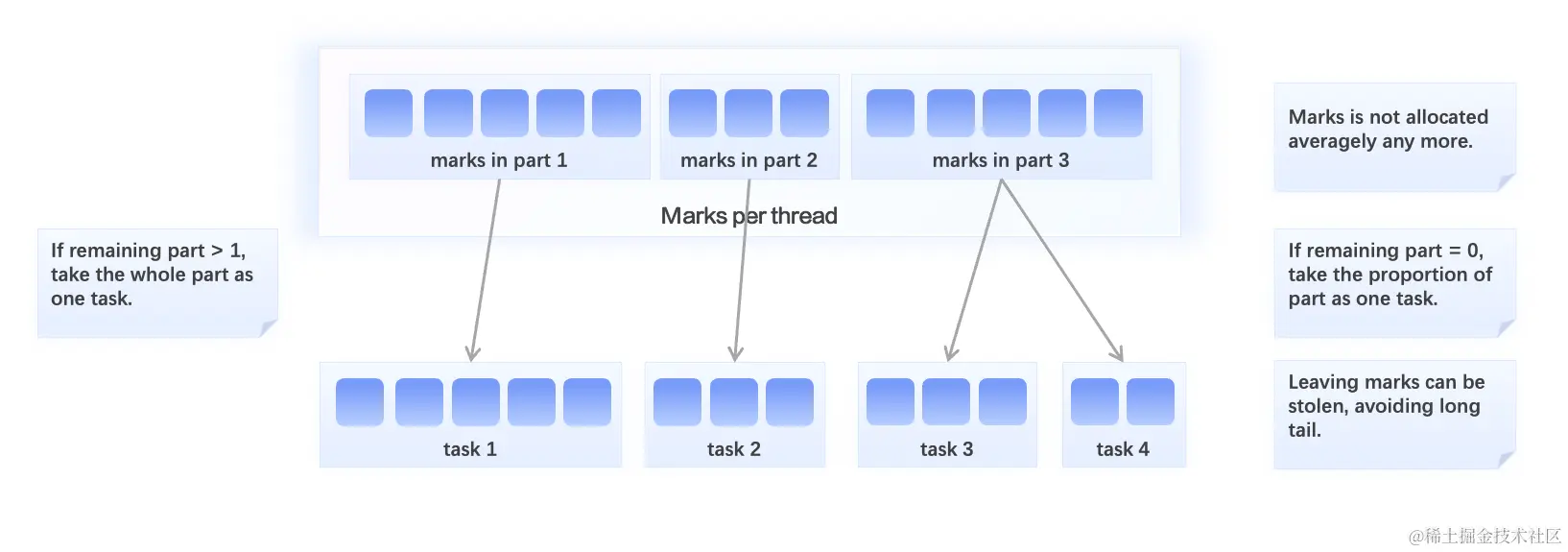 因此,我们采取以下策略进行划分。如果线程的任务队列中剩余的 Part 数大于等于 1,意味着有剩余的任务可以被其余线程 Steal,此时我们考虑以 Part 为单位对 Read Task 进行划分,Part 文件的大小决定了这一 Read Task 的大小。如果线程的任务队列中没有剩余的 Part,此时我们考虑将该 Part 进行进一步拆分,取其中一定比例的 Mark Range 作为一个 Read Task,剩余的 Mark Range 可以作为单独的 Task 被其余线程 Steal。如果 Part 过小,即包含的 Mark Range 过少,我们则会避免此次拆分。
