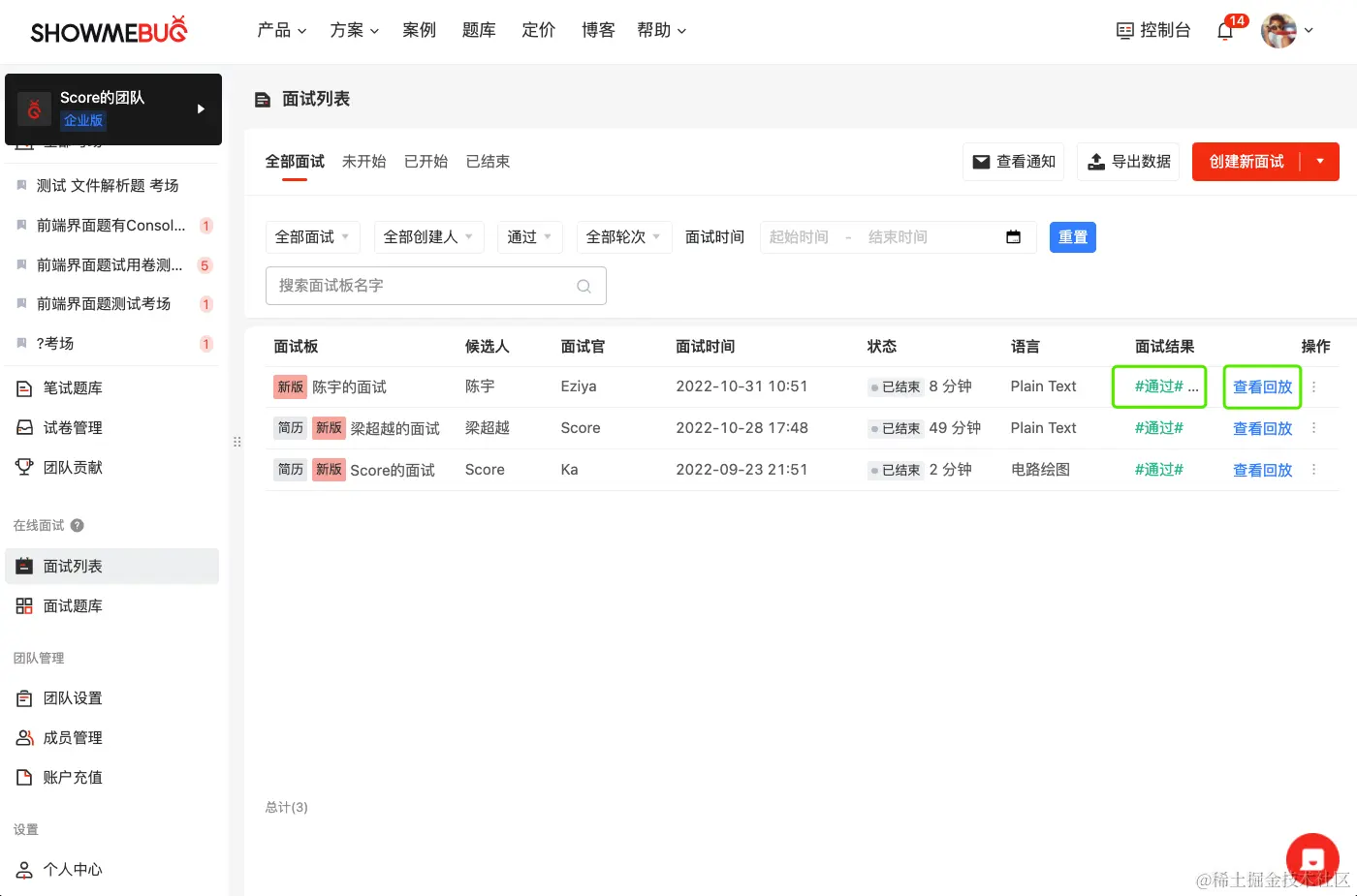 在招聘的时候,无意间发现了 ShowMeBug 这个平台,发现使用他来做【在线笔试】和【在线面试】非常方便。第一,他的帮助文档很细致全面(有视频讲解),操作也很简单,配备的题库和 AI 组卷和评卷功能也很赞,用了之后直呼“真香”,并且他现在对于中小型企业还是免费的,所以各位老板也可以尝试起来。