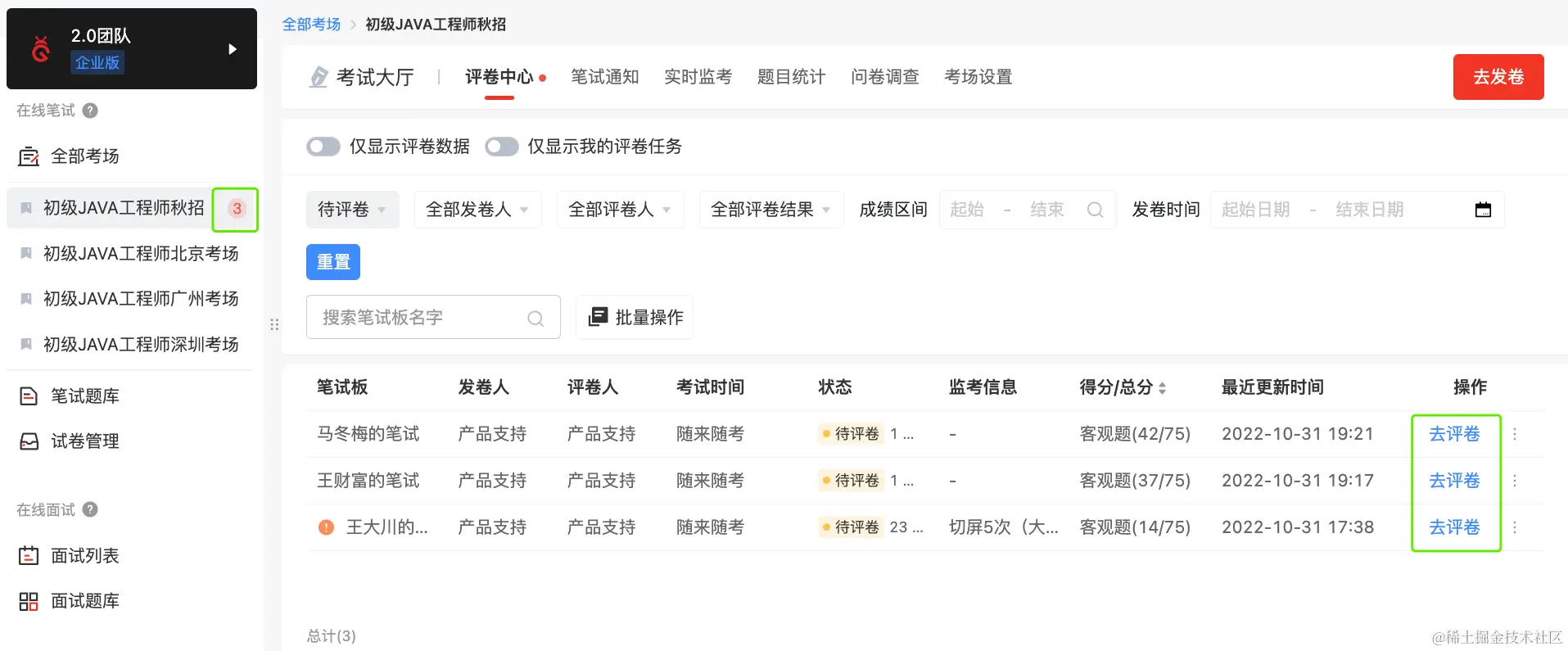 - 评测 -> 候选人做完题目之后,可以去评卷(平台支持 AI 自动评卷):