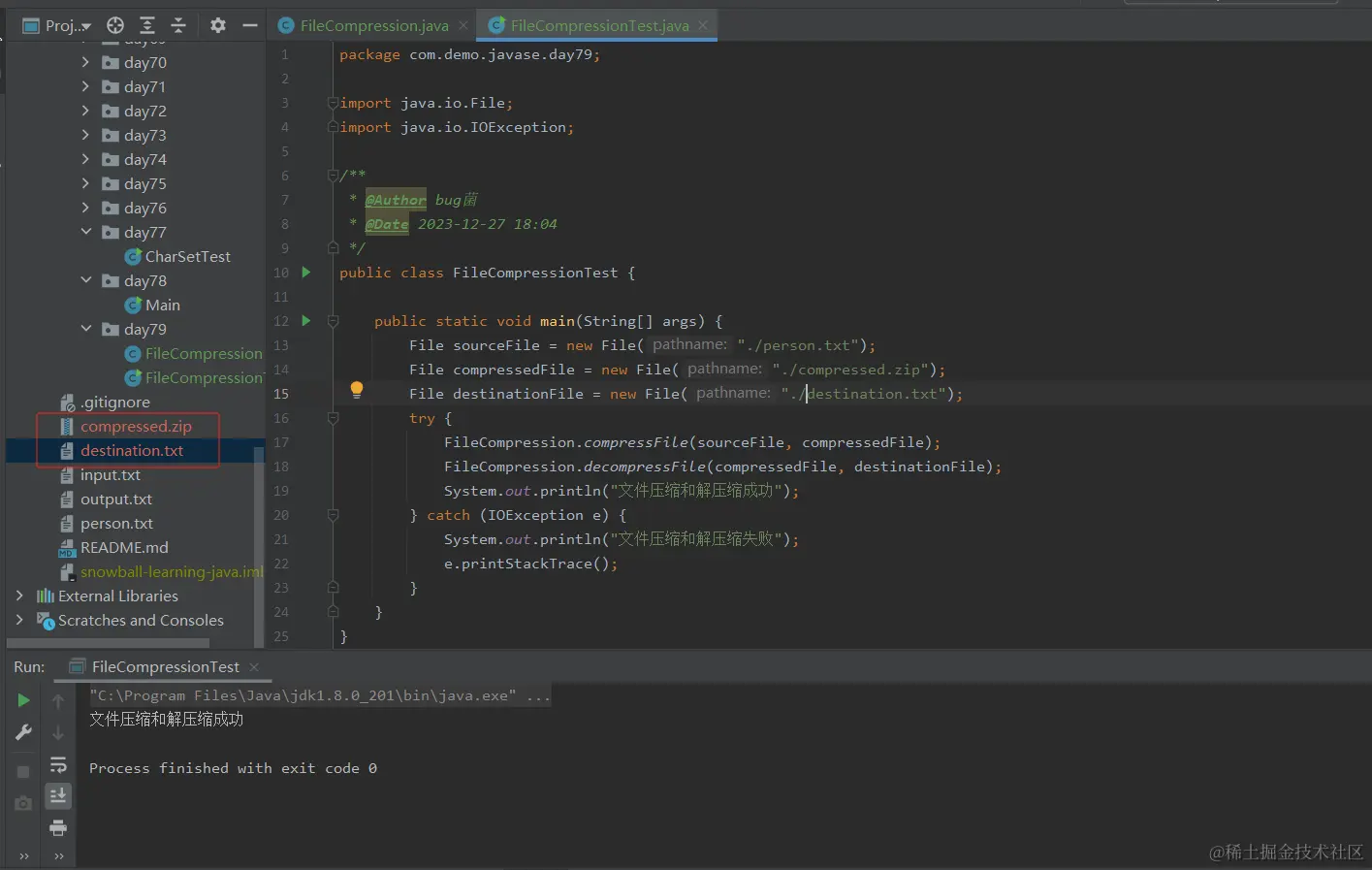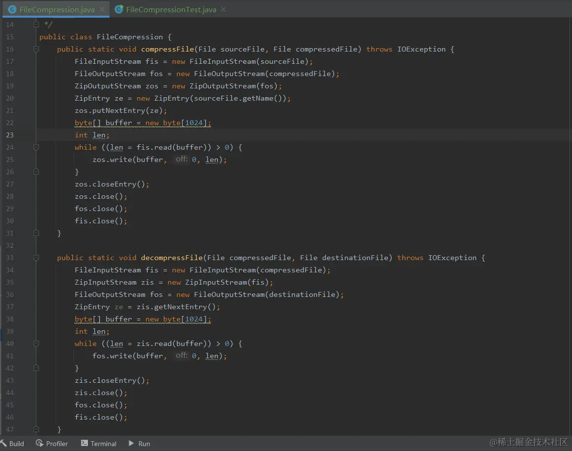 FileCompressionTest的公共类,并包含一个名为main的静态方法。这个类用于测试文件压缩和解压缩的功能,这里基本大家都能懂。 -