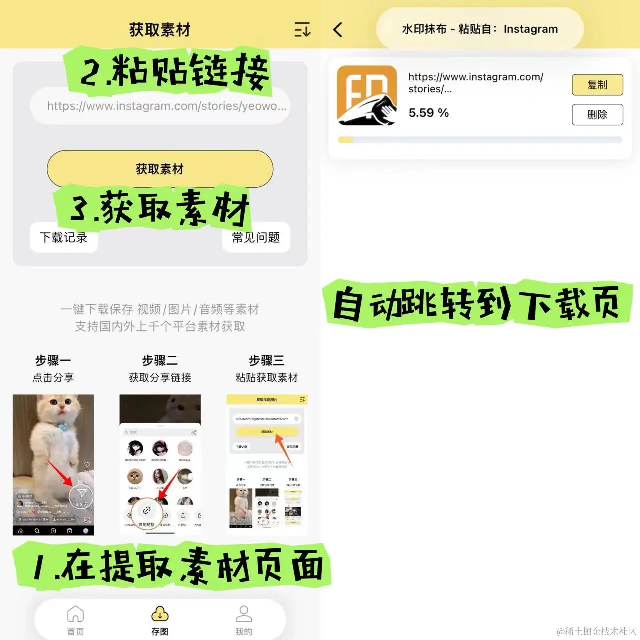 这个时候就可以拿出我们的——【水印抹布】App,在提取素材页面粘贴链接后点击获取素材就会自动跳转到下载页面啦~