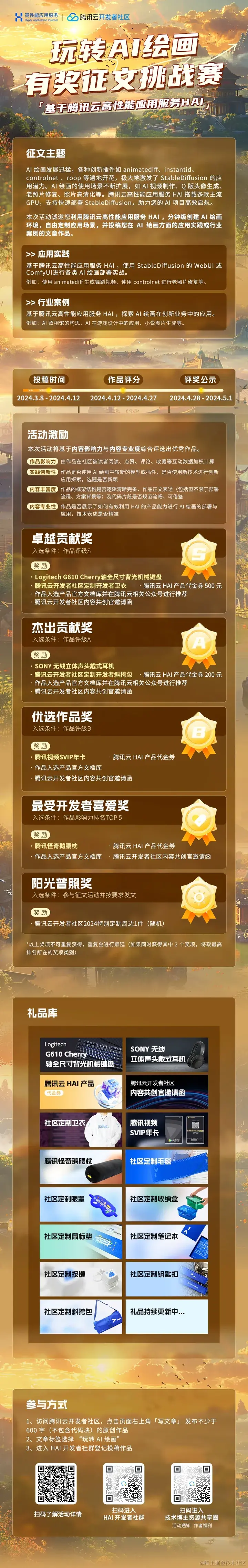 腾讯云开发者社区联合腾讯云高性能应用服务 HAI诚邀您利用腾讯云高性能应用服务 HAI ,分钟级创建 AI 绘画环境,自由定制应用场景,并投稿您在 AI 绘画方面的应用实践或行业案例的文章作品。 本次为开发者们准备了丰厚的礼品,包括但不限于游戏键盘、耳机、腾讯视频年卡、开发者定制办公周边等丰厚活动奖品,等你来拿~