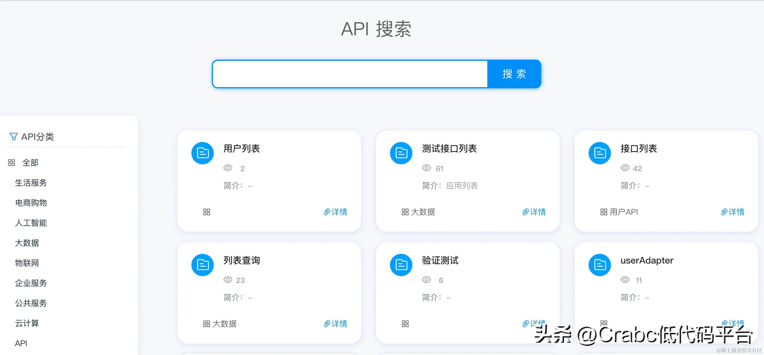 Crabc 数据服务平台是为系统开发提供一个通用的接口平台,通过灵活的动态加载和插件的方式减少企业在基础功能开发的时间投入让开发者更专注于核心功能的思考,提升软件的开发周期和效率;让非技术人员也能快速的开发出一个接口提供数据服务,助力企业数据资产的价值升级;帮助企业构建统一的数据服务平台。