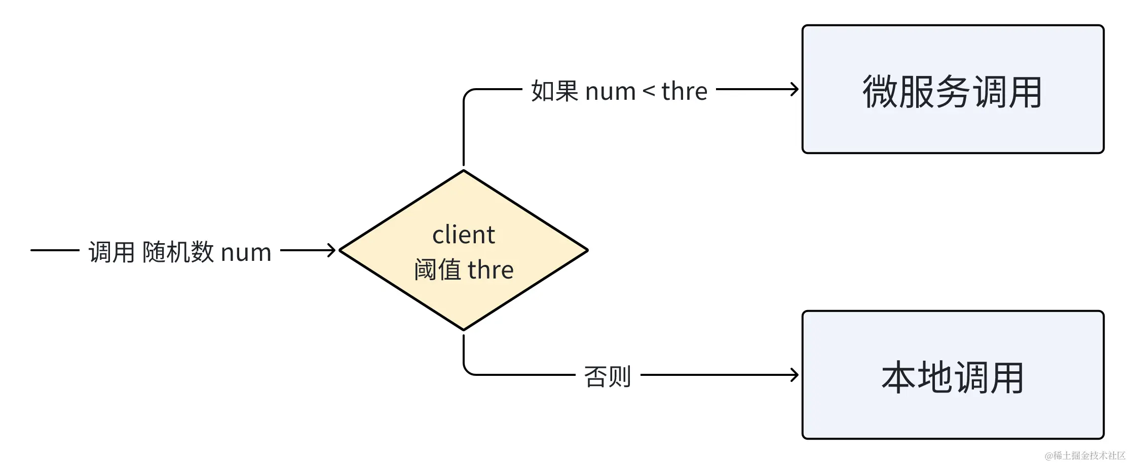 我们不妨试试随机数 + 阈值组合,就是进来的调用带着一个随机数,当这个随机数小于 client 内部设定好的阈值,那么就走微服务调用,否则就走本地调用。