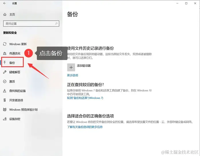 步骤2:在左侧菜单中选择【备份】,然后点击【文件历史记录】 ;