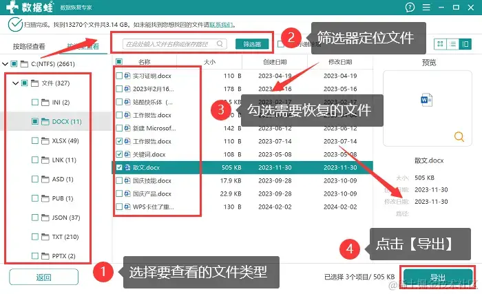 步骤3:查找到需要恢复的文件后,可以将它们勾选上,并点击 【导出】,选择一个合理的保存位置,等待软件导出成功可进行查看。