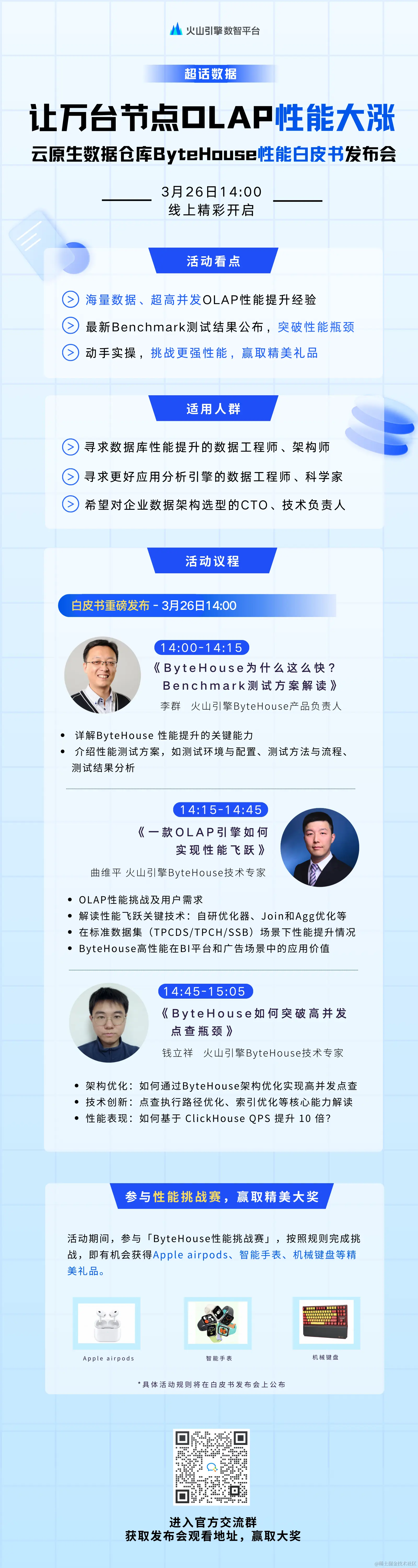 3 月 26 日 14:00,《云原生数据仓库 ByteHouse 性能白皮书》在线上正式发布,会上将发布 ByteHouse 最新 Benchmark 测试结果,并拆解火山引擎如何通过关键优化突破 OLAP 性能瓶颈,以及高性能在广告、BI 等场景中的应用效果。