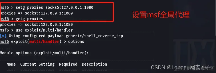 | setg proxies socks5:127.0.0.1:1080 | msf设置全局代理 |